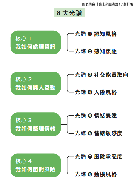 作者劉軒將教育心理學、認知心理學與神經科學,整理成透過核心四維×8大光譜的「性格八角」。了解人生的四個操縱桿,幫你看懂——孩子是用什麼節奏思考、行動、面對壓力,也藉此找出潛能優勢,孩子可以從「雛型實驗」,跨出前進夢想的一小步,陪孩子找到最適合他的路。