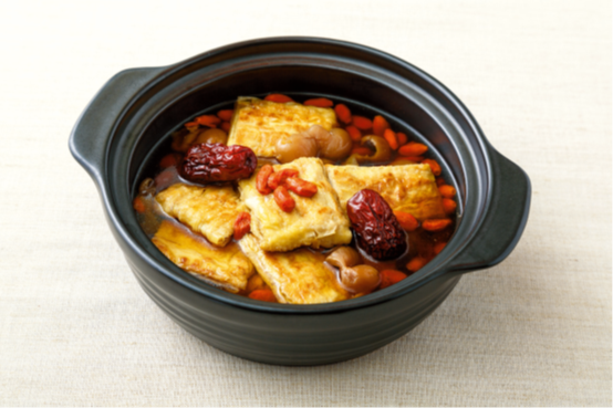 豆皮佐以補益心脾、養血溫臟的福圓及滋陰固腎的枸杞,秋涼時節食之,有為嚴冬預為儲備的況味;天氣再冷些,或女生經來時,可加薑片、薑汁或黑糖同煮。