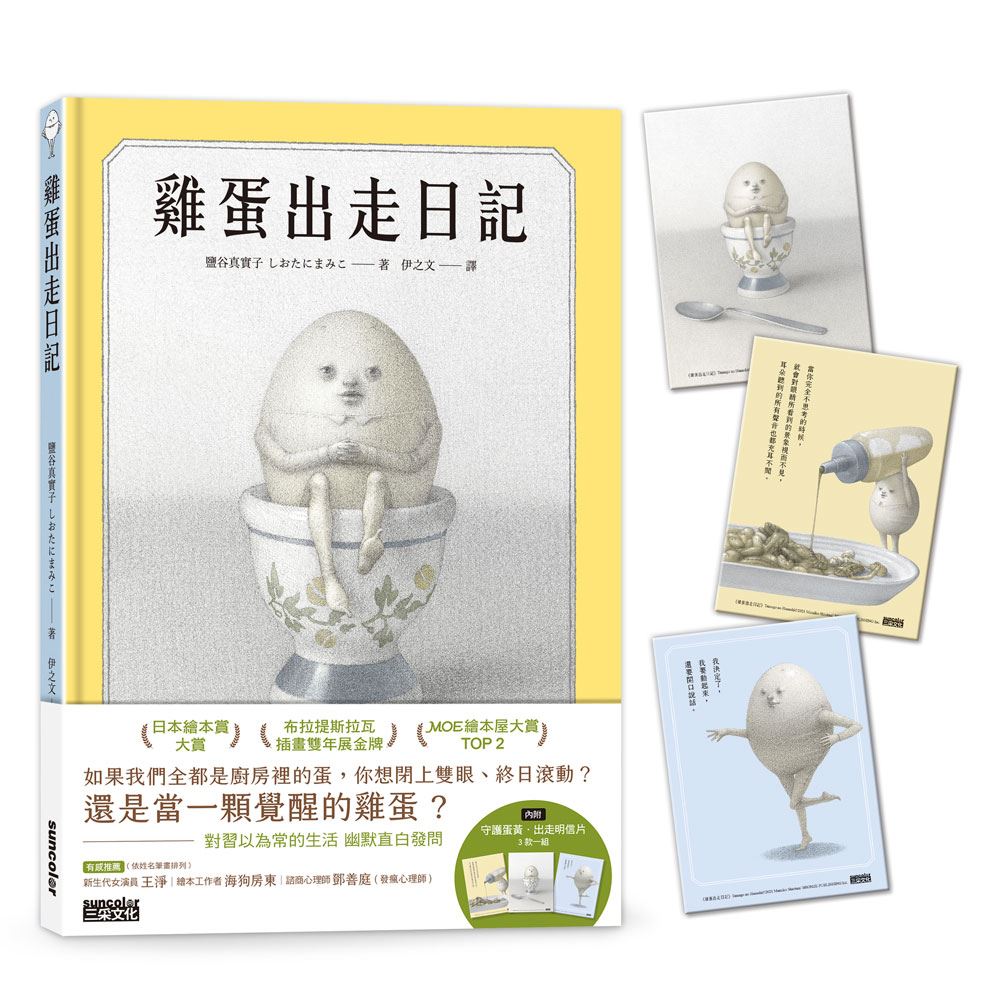 一顆雞蛋橫掃國際繪本大賞 新生代女演員、諮商心理師、繪本工作者共同推薦 文/三采文化 如果有一天靜靜躺在廚房的雞蛋忽然醒了過來,他將會在家中掀起什麼動靜?由日本插畫家鹽谷真實子所創作的繪本《雞蛋出走日記》,以一顆覺醒的雞蛋為故事,這本作品得到許多好評,橫掃 2022 日本繪本賞大賞、布拉提斯拉瓦插畫雙年展(BIB)金牌、 MOE 繪本屋大賞第 2 名,大人與小孩都感受到其中的魅力,更有人說這是一本給大人看的繪本,在台灣也獲得新生代女演員王凈、繪本工作者海狗房東、諮商心理師鄧善庭共同推薦。這個有著五官、四肢的雞蛋,將展開什麼樣的冒險?來從其中對白感受趣味之處吧!  …..看更多