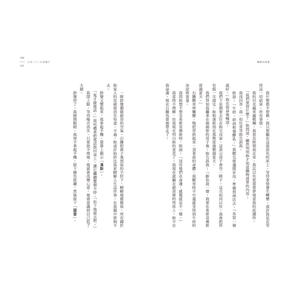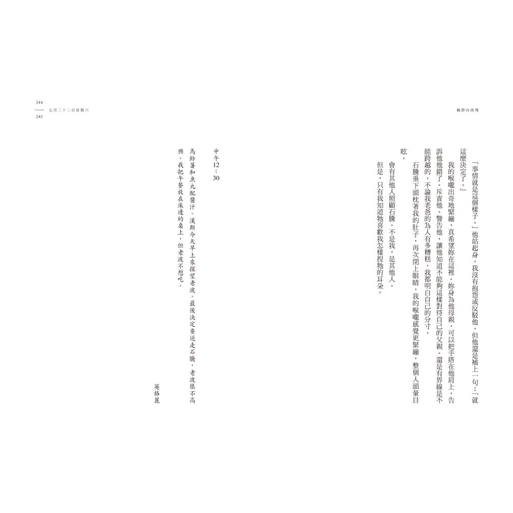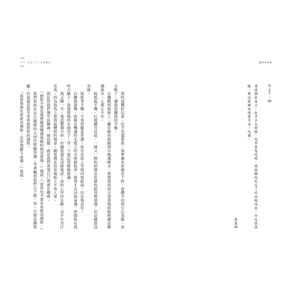 艾麗諾某一天告訴他,他無法再照顧自己時,他會作何反應?當他不再工作,當他的身體機能開始停擺,不再像以前一樣時,他會是什麼樣子?就在此時,我意識到他可能會變得像妳一樣,忘了艾麗諾,恍恍惚惚地度過每一天。我甩了甩頭。我不想去思考這種事。