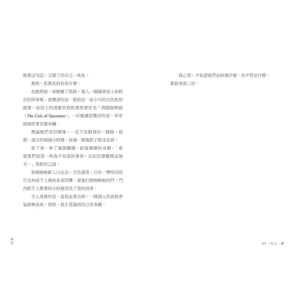 「我決定去旅行,暫時逃離這一切。旅程第一晚,我遇上了一連串非常離奇的事,最後徹底迷路。就在不曉得該怎麼辦的時候,我無意間來到一間咖啡館,店裡不僅有美味的食物、親切友善的人,菜單上還印著很不尋常的問題。」