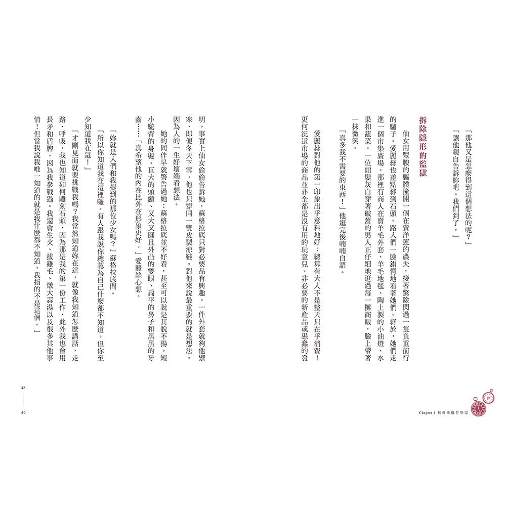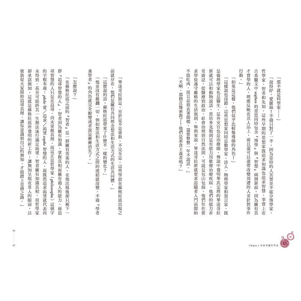 「說得好,愛麗絲!不過只對了一半,因為當時的人其實並不區分博學家、哲學家、智者和先知。這些早期的思想家既追求知識也追求智慧。事實上在古希臘文中sophos 的意思同時包含『博學』與『智慧』兩個層面。因為擁有真才實學的人,理應反映在其人品上,而且還可以連帶改變周遭的人並針對事件行動。」