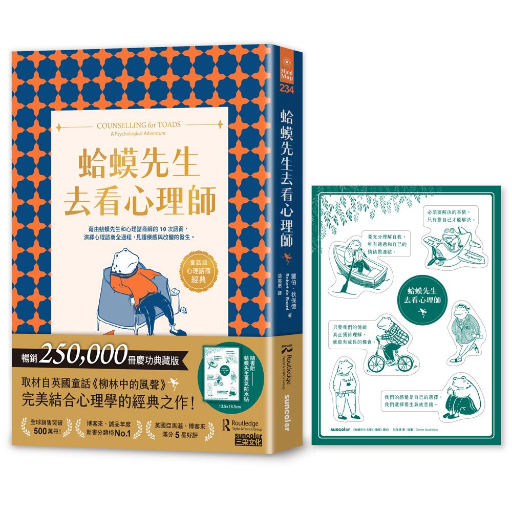 《蛤蟆先生去看心理師》用故事的方式,將蛤蟆因為陷入生命裡的低潮,到漸漸跟隨心理師的引導,一步一步重新認識自己、認識自己的情緒、漸漸找回真正的自己。這條路並不容易,但一路上勇氣和堅定會慢慢增強,成為帶在身上的法寶。