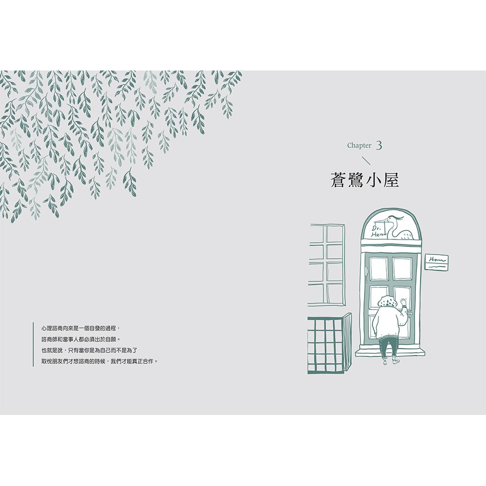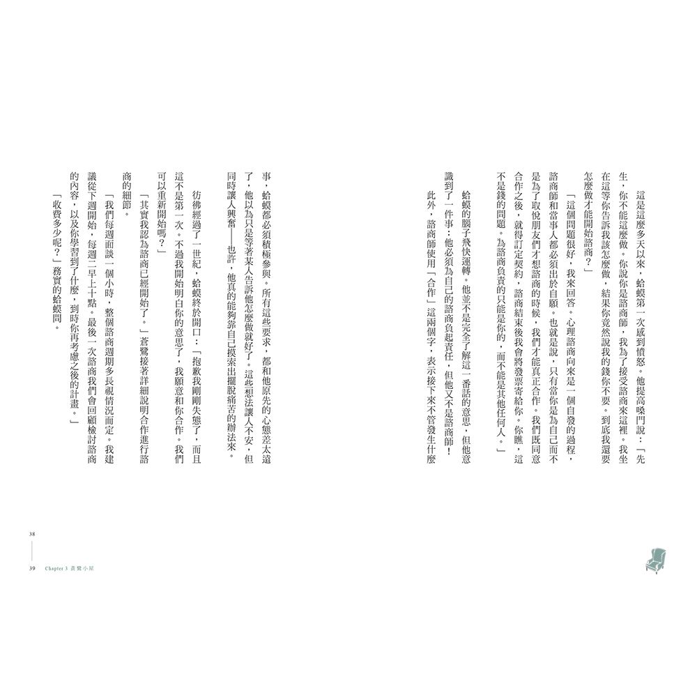 突然間,蛤蟆先生感覺到,他並非只能被動地接受別人的建議,然後又因做不到而挫敗無力。而是,他可以透過主動參與,為自己做些什麼。這正是心理諮商重視的——當事人得為自己的人生負起完全的責任。於是,蛤蟆先生與蒼鷺便展開了一連串「合作」的過程。