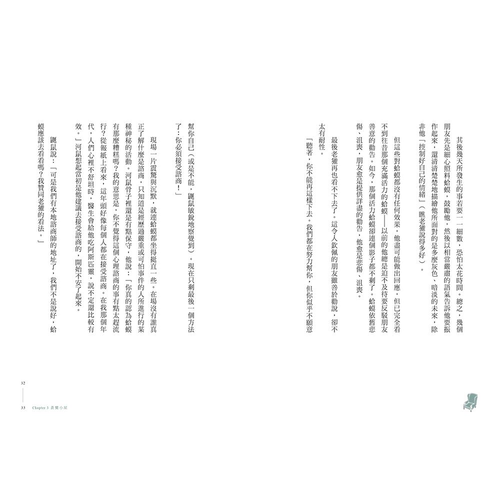 現場一片震驚與沉默,就連蛤蟆都坐得挺直一些。在場沒有誰真正了解什麼是諮商,只知道是經歷過嚴重或可怕事件的人所進行的某種神秘的活動。河鼠骨子裡還是有點保守,他說:「你真的認為蛤蟆有那麼糟糕嗎?我的意思是,你不覺得這個心理諮商的事有點太趕流行?從報紙上看來,這年頭好像每個人都在接受諮商。在我那個年代,人們心裡不舒坦時,醫生會給他吃阿斯匹靈,說不定還比較有效。」河鼠想起當初是他建議去接受諮商的,開始不安了起來。