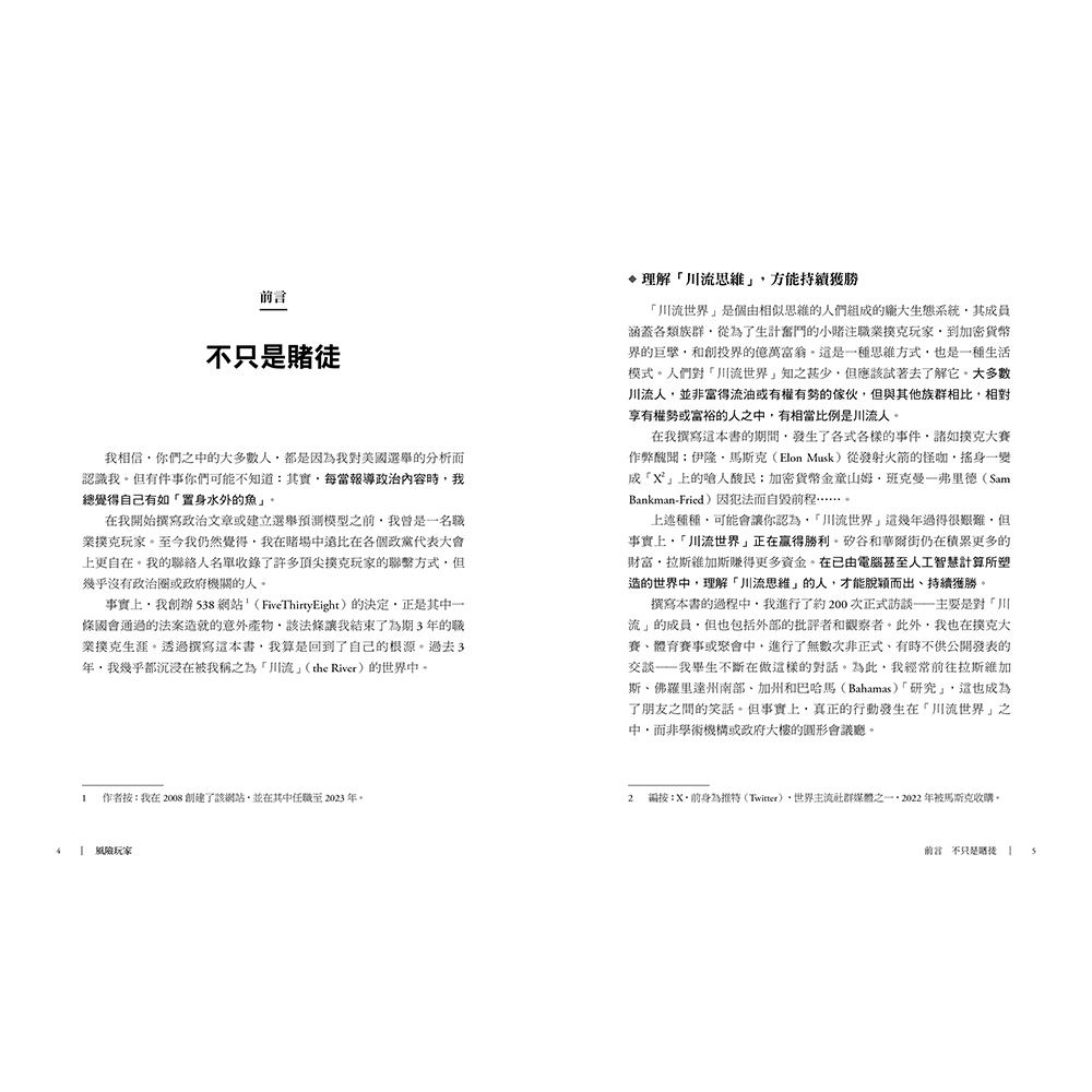 事實上,我創辦538網站(FiveThirtyEight)的決定,正是其中一條國會通過的法案造就的意外產物,該法條讓我結束了為期3年的職業撲克生涯。透過撰寫這本書,我算是回到了自己的根源。過去3年,我幾乎都沉浸在被我稱之為「川流」(the River)的世界中。