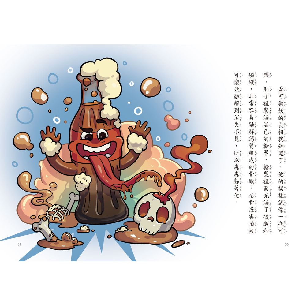 另一個妖怪嘴裡咕嚕嚕的冒著泡,甜甜的說:「讓我來!我讓他們喝一口快樂的泡泡水,從此就離不開我,然後不知不覺中失去健康。」