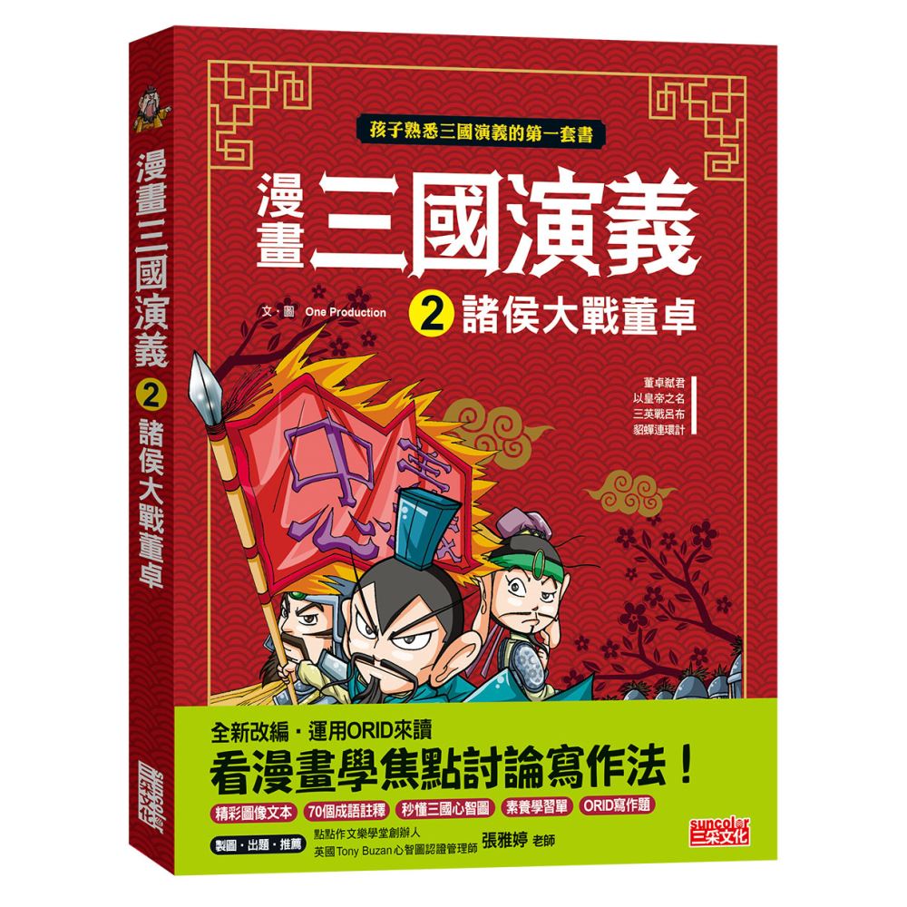 《三國演義》可說是東亞最傑出的歷史小說,也是跨越時代、流傳最廣、影響亞洲最深的暢銷名著。這套全新改編的漫畫,以誇張的人物設計、配合讀者的情節與對白,保留了「鬥智優於鬥力」的東方智慧,讓孩子們享受閱讀《三國演義》的樂趣,以作為孩子有一天閱讀原典的基石。除此之外,本書也延請「點點作文樂學堂創辦人&英國Tony Buzan 心智圖認證管理師」張雅婷老師,特別以漫畫作為文本,撰寫【秒懂三國演義心智圖】,並編寫【閱讀理解PIRLS測驗題】與【結合六何法的ORID焦點討論寫作法】。