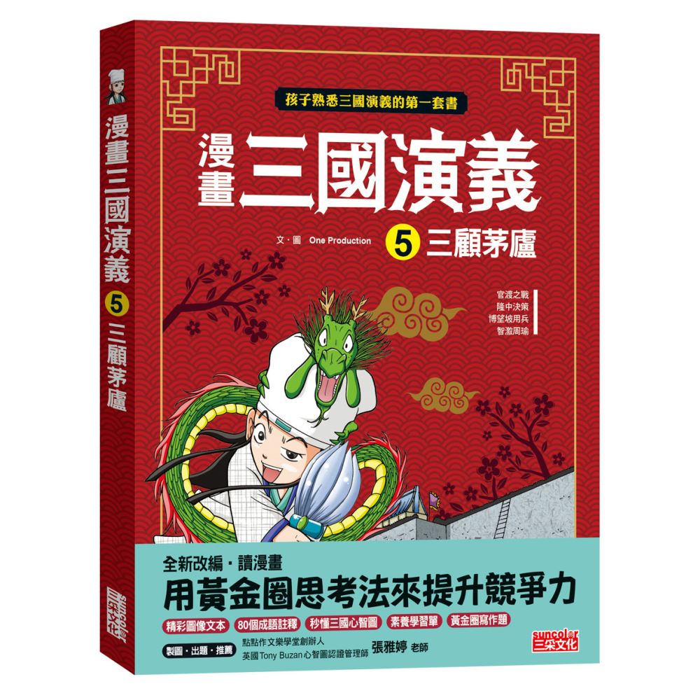 《三國演義》可說是東亞最傑出的歷史小說,也是跨越時代、流傳最廣、影響亞洲最深的暢銷名著。這套全新改編的漫畫,以誇張的人物設計、配合讀者的情節與對白,保留了「鬥智優於鬥力」的東方智慧,讓孩子們享受閱讀《三國演義》的樂趣,以作為孩子有一天閱讀原典的基石。除此之外,本書也延請「點點作文樂學堂創辦人英國Tony Buzan 心智圖認證管理師」張雅婷老師,特別以漫畫作為文本,撰寫【秒懂三國演義心智圖】,並編寫【閱讀理解PIRLS測驗題】與【六頂思考帽寫作法】。