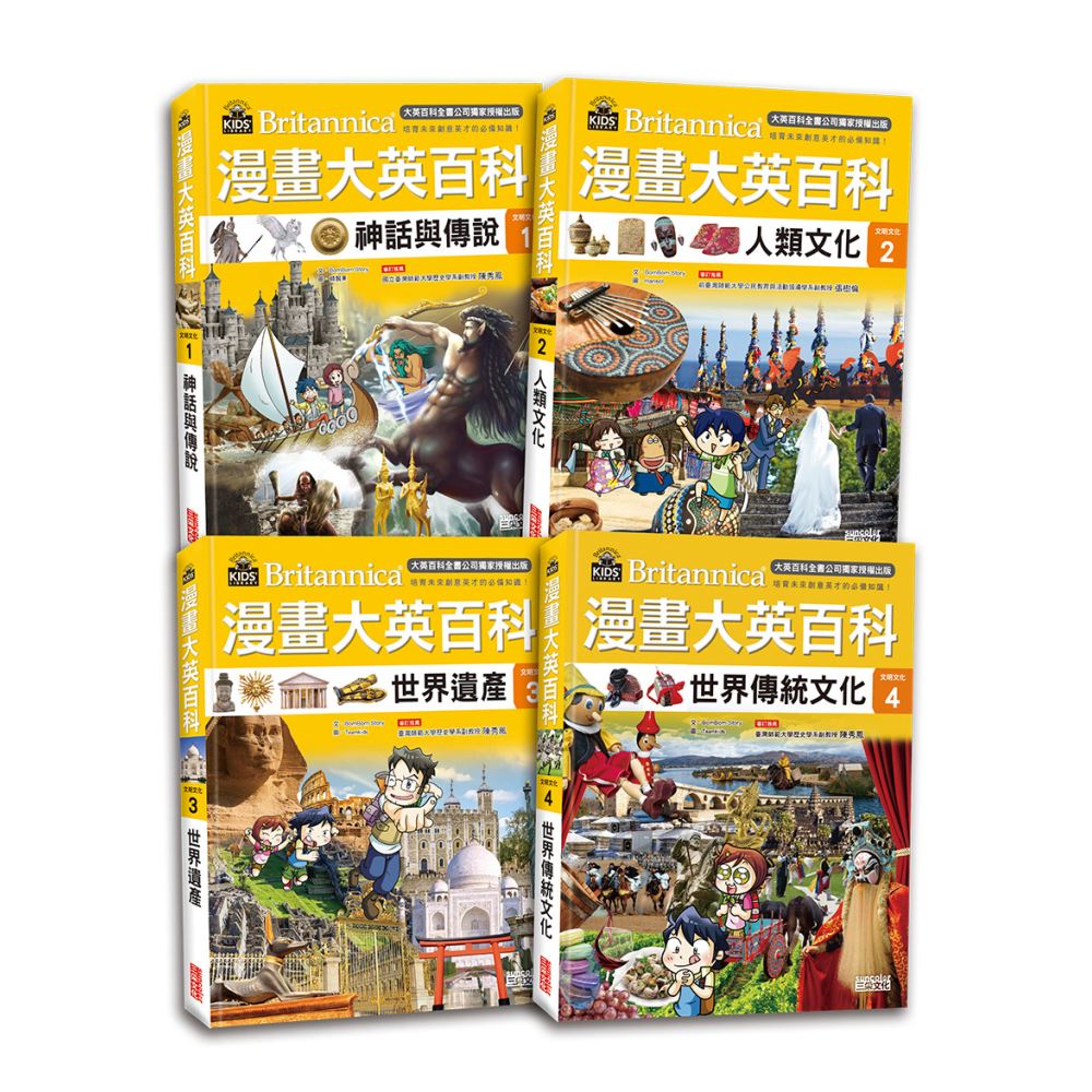 在《大英百科全書》中,文明文化領域所收錄的知識,包含了世界各國流傳的故事、特殊文化,以及世界遺產。《漫畫大英百科-文明文化》套組中,包含了:《神話與傳說》、《人類文化》、《世界遺產》及《世界傳統文化》等四冊,涵蓋將近120條大英百科詞條、80個核心知識,帶領孩子探索世界各國的文化特色、歷史遺跡以及民俗文化等。