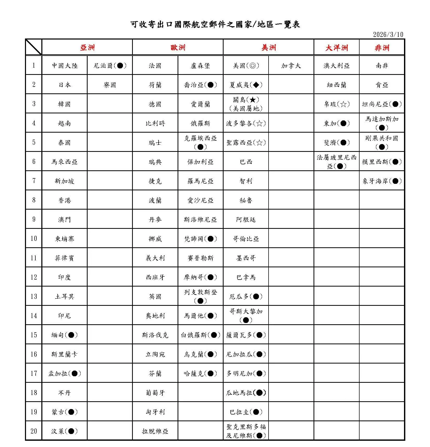 未加註符號之國家/地區,代表可收寄國際航空函件及國際包裹