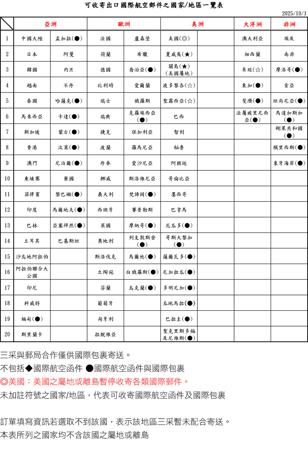 三、 【中華郵政】配送之航空郵件, 可收寄出口國際航空郵件之國家,明細如下: