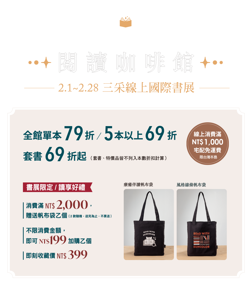 1.全館滿 $2,000 贈「三采 Suncolor 帆布袋」乙個(隨機不挑款,贈完為止)。亦可享加購價 $199 或直購價 $399。